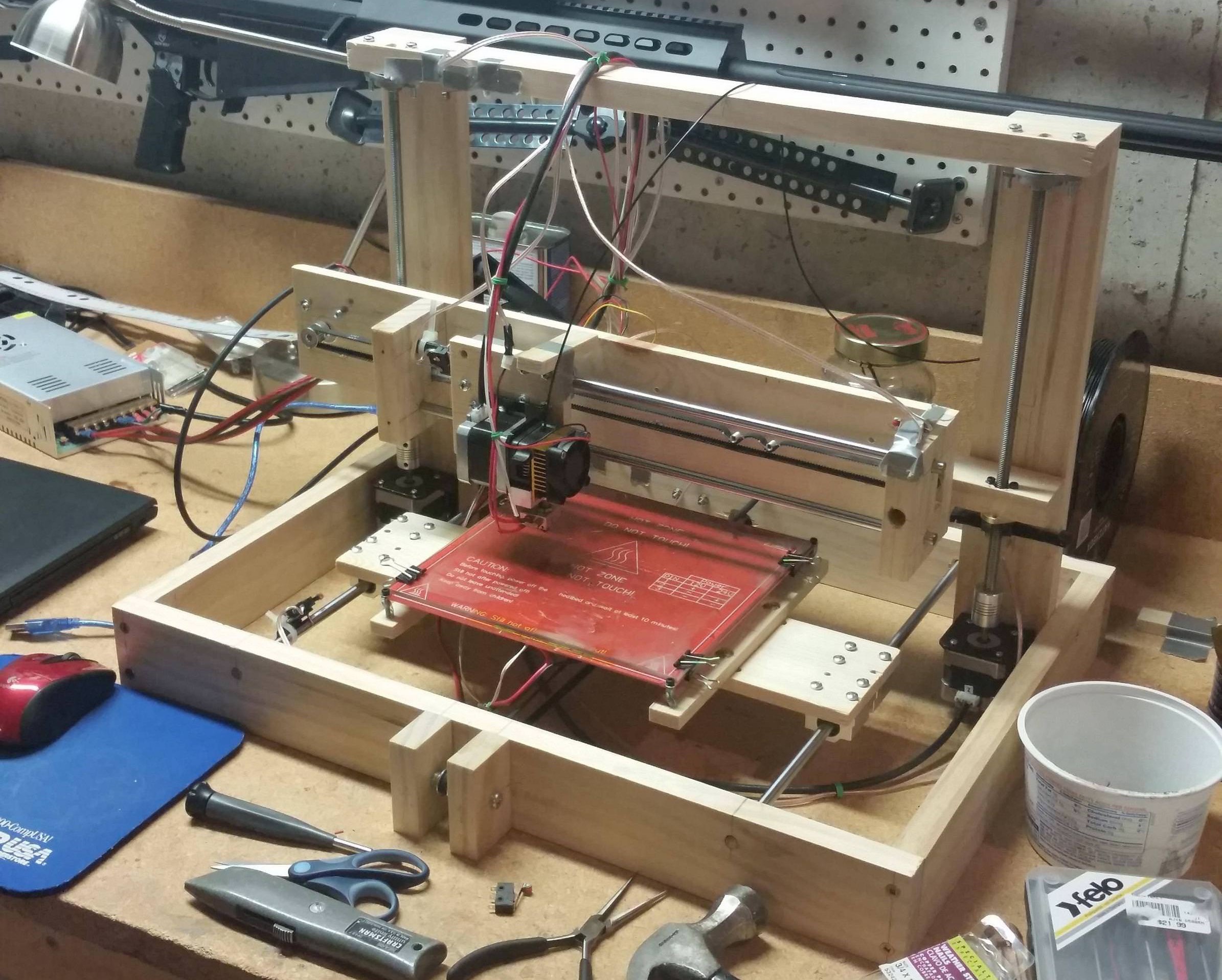 I write these posts after I finish building something. Sometimes I forget to take pictures of some of the steps along the way. Here’s what I forgot to document. I made the X-axis carriage, installed some linear rods, bearings, steppers, and belts. Just like that, I had the worst 3d printer ever made.