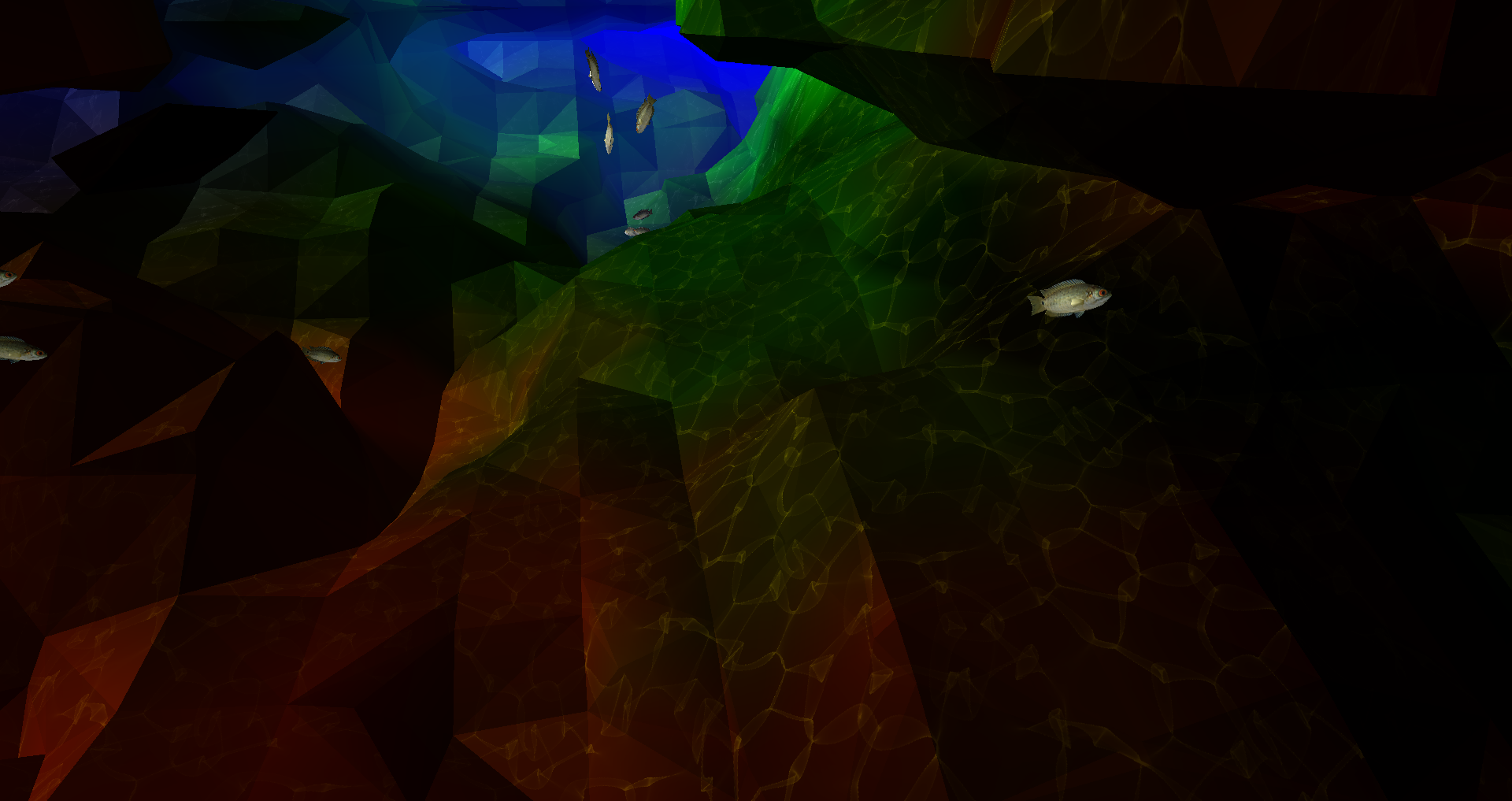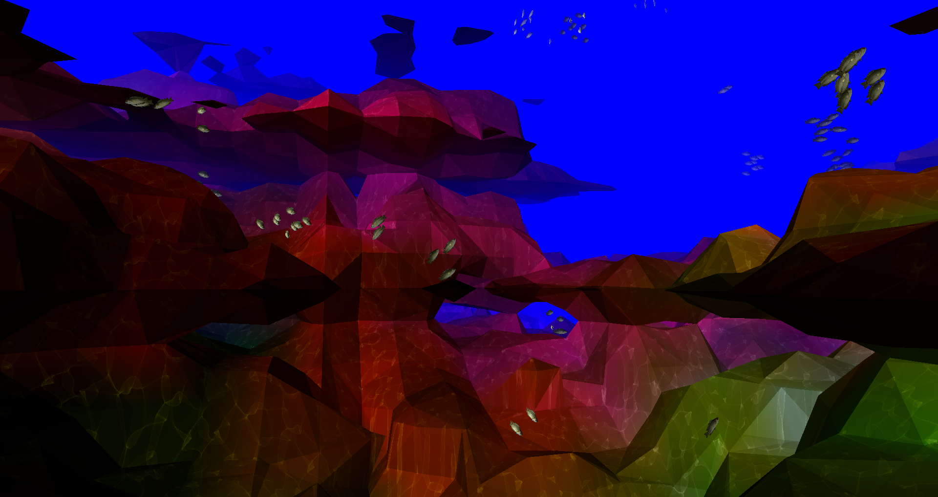 This picture shows the final result of a 2-semester long project to construct an underwater scene in C/OpenGL. It took a