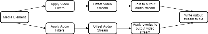 - Create media stream for each media element and apply timeline filters sequentially. Both visual and audio streams must be processed separately.